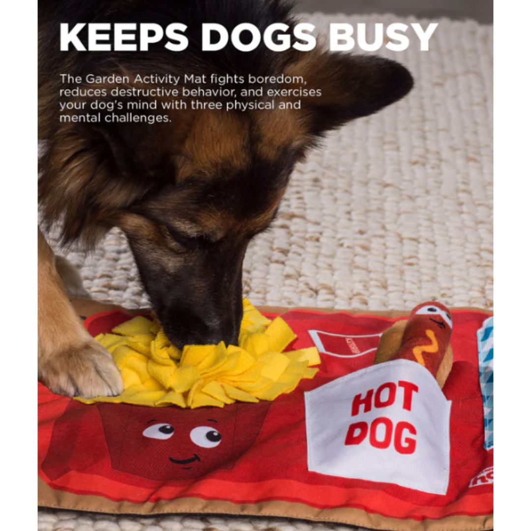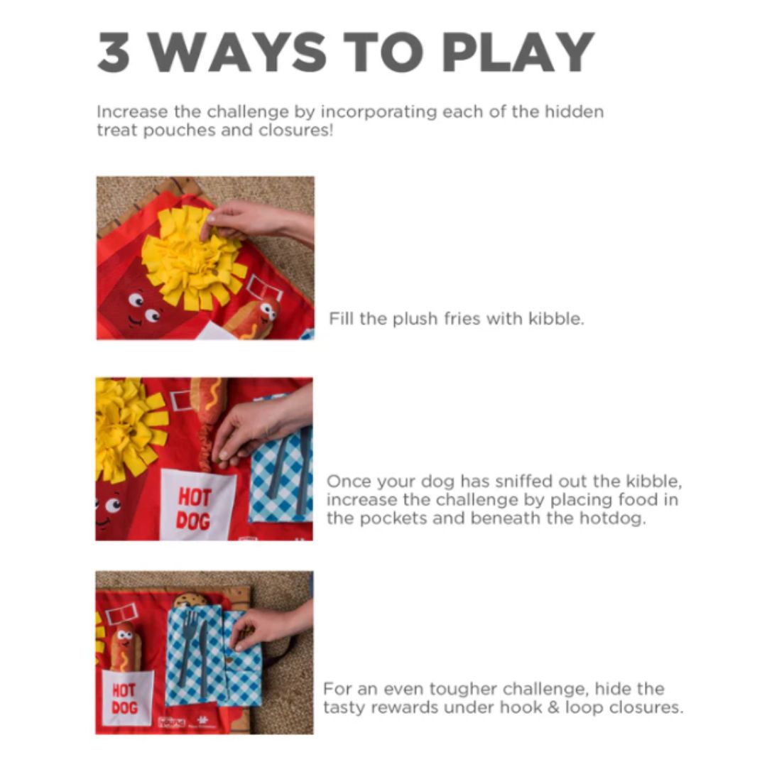 Upgrade enrichment time with the Nina Ottosson by Outward Hound Activity Matz – Fast Food Fun. This interactive dog snuffle mat challenges your dog with layered treat pockets and optional hook-and-loop closures for added difficulty. Designed as a Level 2 dog puzzle, it keeps curious minds engaged, helps reduce boredom-related behaviours, and provides meaningful mental and physical exercise. Easy to clean, non-slip, and foldable for storage.