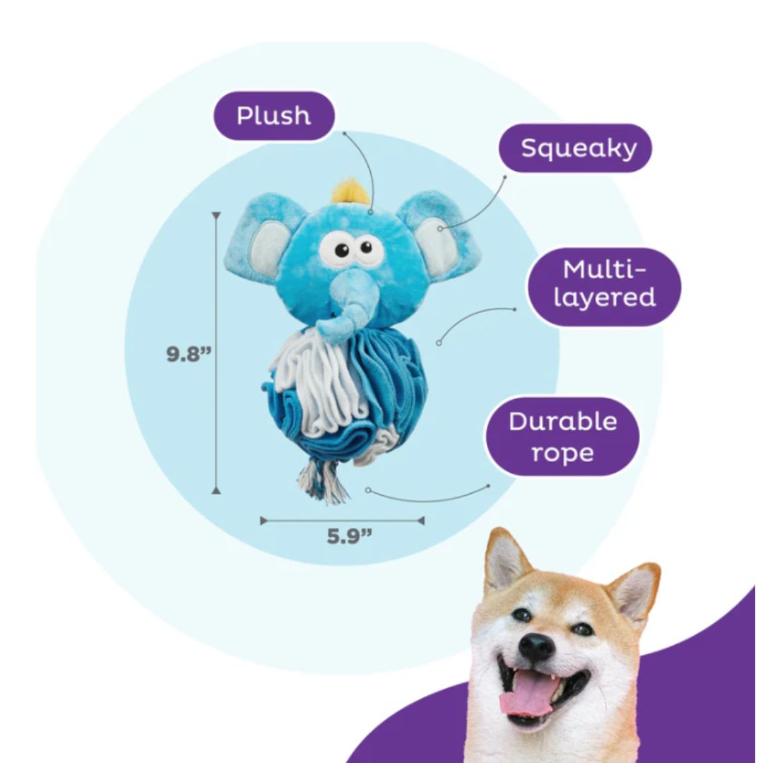 Turn playtime into purposeful enrichment with the Nina Ottosson by Outward Hound Stuff' n Snuffle Elephant. This interactive snuffle dog toy combines a plush elephant with a hidden snuffle ball, encouraging your dog to sniff, paw, and forage for treats. Once the rewards are found, the soft plush body, rope, and squeaker keep the fun going—perfect for reducing stress and boredom.